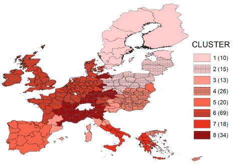 Il cluster 8 rappresenta una sorta di cerniera tra la parte di Europa in cui il primario assume tratti marcatamente continentali (cluster 6) e quella ad agricoltura mediterranea (cluster 5 e 7). In questo raggruppamento di unità territoriali il valore aggiunto agricolo sembra essere particolarmente sensibile alle variabili di natura socio-economica (Pecci, Sassi, 2007).