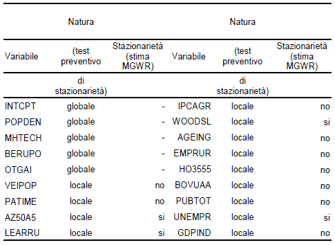 Il test preventivo di stazionarietà ha consentito di suddividere le variabili in due gruppi, globali e locali (rispettivamente, quelle che non presentano dipendenza spaziale e quelle con dipendenza spaziale; colonne 2 e 5). Questa suddivisione ha portato ad utilizzare un modello Mixed Geographically Weighted Regression (MGWR) (Fotheringham et al., 2000; 2002). Con questa specificazione il modello tratta le variabili globali come in un normale modello di regressione OLS mentre quelle locali sono sottoposte ad una stima GWR. Le colonne 3 e 6, sempre in tabella 2, indicano la presenza o l’assenza di dipendenza spaziale nei parametri stimati con la MGWR relativamente alle variabili di natura locale.