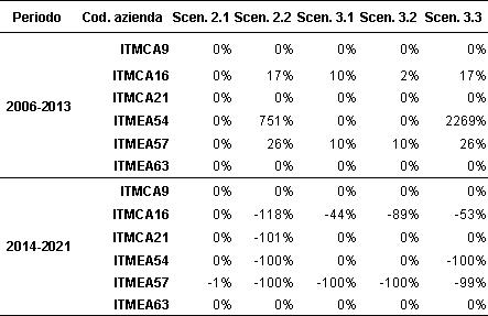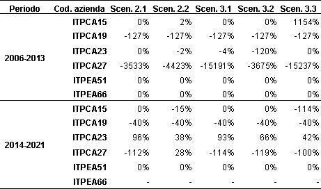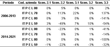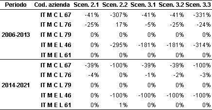 (2) Valori negativi molto alti derivano dal rapporto tra un valore alto di disinvestimento nello scenario considerato ed un basso valore di investimento nello scenario di baseline (scenario 1). Il risultato apparentemente sorprendente è da attribuirsi soprattutto al basso livello di investimento previsto dall’azienda nello scenario 1, che, in alcuni casi, era prossimo allo zero.