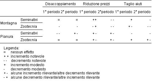 Le aziende zootecniche in aree di montagna tendono ad avere una reazione più evidente al disaccoppiamento e si dimostrano sensibili alla riduzione dei prezzi, ma non altrettanto alla riduzione degli aiuti. Inoltre, il comportamento è più omogeneo tra gli scenari nonostante si evidenzino rilevanti differenze tra aziende (Tabella 4).