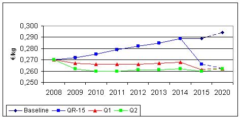 Chiaramente, se il confronto avviene rispetto al prezzo potenzialmente raggiungibile in caso di mantenimento delle quote, la riduzione potenziale al 2015 è superiore al 10%, ma in questo caso l’incremento di benessere dei produttori agricoli andrebbe a scapito della partecipazione dell’UE al mercato lattiero-caseario mondiale. Anche se i livelli della produzione e dei prezzi non sono molto diversi nei tre scenari, le due figure chiariscono come, nel caso dello scenario QR-15, la rimozione improvvisa delle quote (il cosiddetto hard landing) determinerebbe un vero e proprio shock sia a livello di produzione che di prezzi, con difficoltà facilmente immaginabili anche per gli operatori a valle, mentre negli scenari Q1 e Q2 (il cosiddetto soft landing) l’adattamento sarebbe molto più graduale.