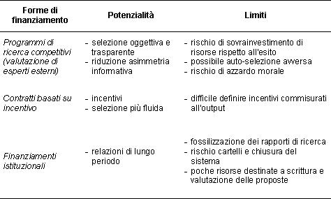Tabella 1 - Potenzialità e limiti delle forme di finanziamento pubblico alla ricerca