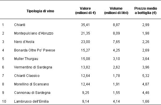 E’ difficile fornire dei dati sistematici sui prezzi, ma un’indagine recente svolta da IRI Infoscan per Vinitaly sulla vendita di vino nella GDO (2008) fornisce delle interessanti indicazioni in tal senso (Tabella 1). Le tre principali denominazioni vendute sugli scaffali della grande distribuzione sono rispettivamente una DOCG (Chianti), una DOC (Montepulciano d’Abruzzo) e una IGT (Nero d’Avola: IGT Sicilia). Quest’ultimo prodotto presenta un prezzo medio a bottiglia più elevato di alcune DOC (Montepulciano d’Abruzzo o Lambrusco), così come alcune DOC hanno prezzi più elevati di alcune DOCG (es. Cannonau rispetto al Chianti) e la differenziazione di prezzo tra prodotti di regioni diverse e all’interno della stessa regione è molto elevata.