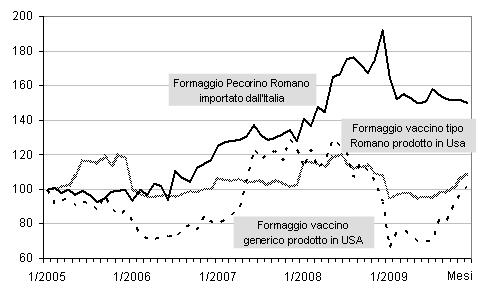 Figura 2 - Prezzi mensili nel mercato USA del Pecorino Romano importato dall’Italia, dei formaggi vaccini generici e dei formaggi vaccini tipo Romano prodotti negli USA - Numeri indice - (2005 =100)