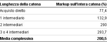 L’indagine, inevitabilmente circoscritta a un limitato numero di prodotti, ha tuttavia un suo pregio. Grazie all’ausilio della Guardia di Finanza si sono potuti ricostruire con sufficiente precisione i) gli aumenti di prezzo che un prodotto subisce lungo la catena del valore (lo stesso prodotto, senza le distorioni derivanti dalle informazioni relative a prodotti analoghi ma di diversa qualità, ovvero dai prezzi dello stesso prodotto ma in una diversa stagione) e ii) i principali elementi di inefficienza lungo la filiera legati sia alla lunghezza della catena distributiva che alle caratteristiche delle diverse fasi di scambio.