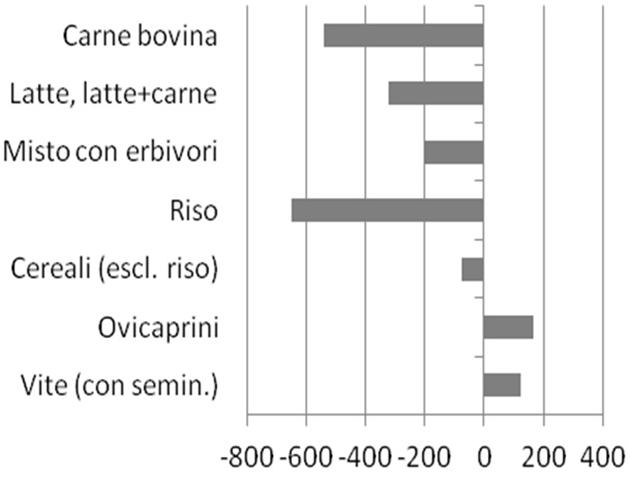 Figura 3 - Differenza tra il pagamento percepito al 2010 (titolo III e IV) e il pagamento di base + greening al 2019, per orientamento tecnico economico aziendale (euro / ettaro)