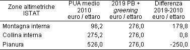 La riforma prevede la convergenza entro il 2019 dei pagamenti del Primo pilastro verso un valore unitario omogeneo all’interno di una singola regione. Partendo da questo assunto e tenuto conto che la Sau elegibile in Piemonte potrebbe teoricamente raggiungere il milione di ettari (+26%), l’importo mediamente percepibile dai possibili beneficiari sarebbe di circa 276 euro a ettaro. Questa cifra rappresenta uno scenario estremo, poiché ipotizza che tutti i potenziali beneficiari aderiscano; inoltre non tiene conto di eventuali incrementi derivanti da aiuti accoppiati o dall’appartenenza a zone svantaggiate, ancora non definiti, la cui incidenza varierà da un’azienda all’altra.