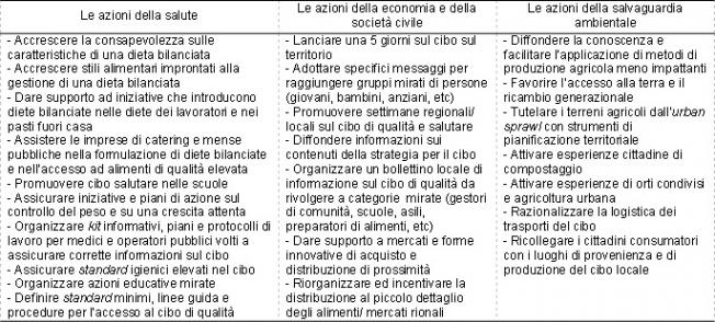 Tabella 2 - Le azioni di intervento coordinato sul cibo