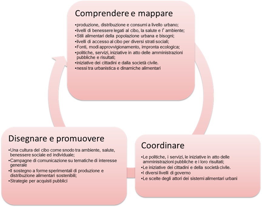 Per affrontare in modo più razionale il tema del cibo, di recente, nei Paesi anglofoni e non solo, stanno prendendo avvio azioni di ripensamento e organizzazione di politiche del cibo nei multiformi aspetti ([link], American Planning Association, 2007). In questa prospettiva, le amministrazioni locali individuano strategie urbane per il cibo organizzate secondo principi generali capaci di ispirare politiche urbane innovative sul cibo; promuovendo studi capaci di identificare i problemi legati alla corretta gestione del cibo; definendo piani di azione coerenti in ambito urbano.