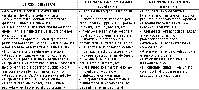• individua gli strumenti del Piano del cibo nel coordinamento di una pluralità di politiche già disponibili nelle comunità, tra cui: la pianificazione territoriale, a sostegno della salvaguardia dei suoli agricoli; l’organizzazione del commercio, a supporto dell’ampliamento della capacità di scelta dei consumatori; l’educazione alimentare, le politiche della prevenzione della salute, le politiche ambientali, la gestione dei rifiuti, la promozione di responsabilità e innovazione nella gestione degli acquisti pubblici, la formazione e l’informazione mirata; il supporto alle fasce deboli della popolazione, le politiche di supporto alle attività agro-alimentari.