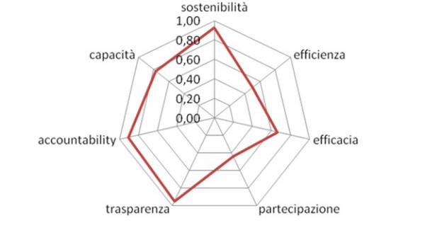 La figura 2, a titolo puramente esemplificativo, mostra come i valori di tali indici compositi, riferiti alle 7 dimensioni chiave della governance, possono essere rappresentati in forma sintetica. L’esempio riguarda il caso studio di un Ente Parco. Come è facile osservare, emergono chiaramente nell’esempio i settori della governance in cui l’Ente valutato è più debole (partecipazione ed efficienza) e quelle invece in cui è più avanzato (sostenibilità, trasparenza, accountability).