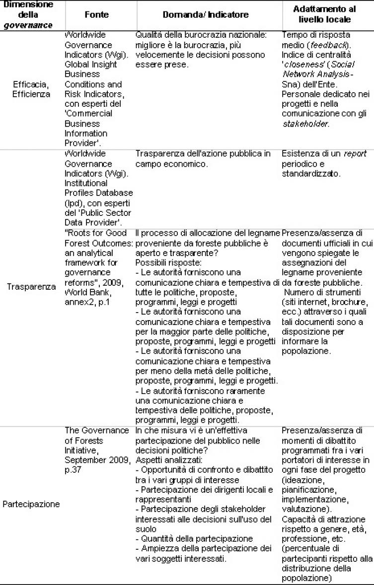 - 3. In particolare, ma non solo, sono stati adattati indicatori tratti da Wgi (Banca Mondiale), Fgdt (Ard – WB) (2009), Gfi (World Resource Institute) (2009), Famfg (Profor/Fao) (2011) e le valutazioni dei Programmi di Sviluppo Rurale della Commissione Europea.