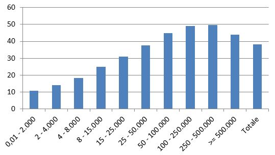 Figura 2 - Incidenza percentuale della superficie in affitto sulla Sau per classe di dimensione economica (euro)
