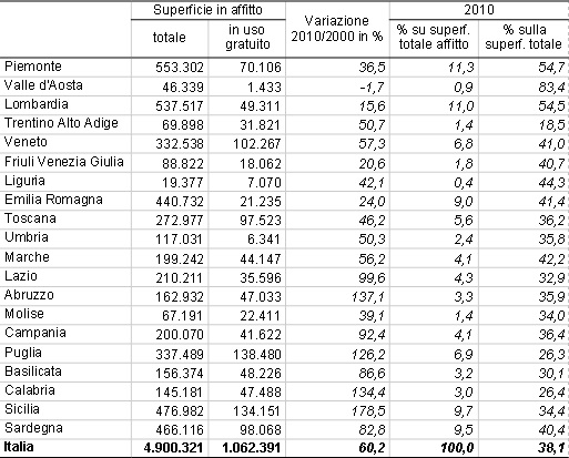 Tabella 1 - Evoluzione della superficie totale in affitto a livello regionale (superficie in ettari)