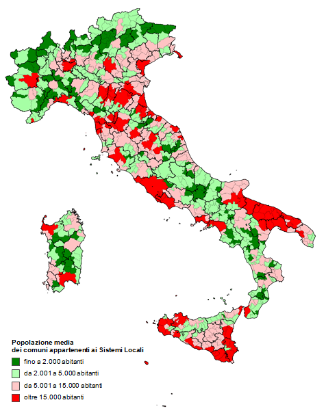I sistemi locali presentano naturalmente geografie differenziate e segnalano criticità specifiche, a partire da quelle della frammentazione (Figura 1), visto che per 120 dei 686 sistemi locali (con il 3% della popolazione ma con oltre il 15% del territorio) la dimensione media dei comuni rimane, per l’intero aggregato, inferiore ai 2000 abitanti.