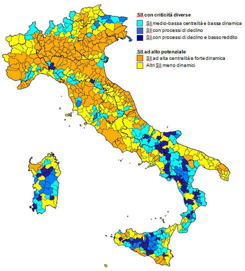 I Sll “con criticità” sono quelli nelle tre tonalità di blu: gli aggregati azzurri sono quelli in una condizione meno critica, con accessibilità medio-bassa e dinamica abbastanza stabile (accessibilità complessiva inferiore a 100 mila abitanti, ma crescita superiore a –1 %); gli aggregati in blu presentano valori di accessibilità bassi e dinamiche negative (accessibilità della popolazione residente inferiore a 100 mila abitanti e dinamica inferiore a - 1%), e lo stesso vale per gli Sll in blu più scuro, la cui condizione è aggravata dal fatto di detenere medie di valore aggiunto pro capite al 2005 inferiore all'80% della media nazionale (17.428 € con una media nazionale di 21.785 €).