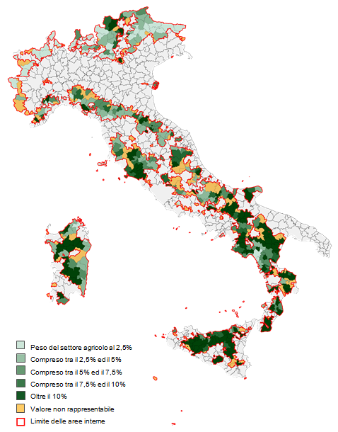 Note: La carta è stata prodotta confrontando due grandezze: una è il valore aggiunto totale del Sistema Locale del Lavoro per kmq di estensione, l’altra è il valore aggiunto agricolo del Sll sempre rapportato alla sua estensione.