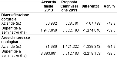 I requisiti del greening così come definiti nell’accordo finale si distanziano in maniera considerevole dalla proposta iniziale della Commissione europea del 2011, che prevedeva misure molto più stringenti, tra cui l’applicazione della diversificazione sulle superfici a seminativo superiori a 3 ettari, l’obbligo del mantenimento delle foraggere permanenti a livello aziendale e l’introduzione di aree d’interesse ecologico sul 7% di tutta la superficie agricola, esclusi i prati permanenti. In questa sua forma il greening aveva però suscitato numerose critiche da parte del mondo produttivo e dalla maggioranza degli Stati membri, non solo per la dubbia efficacia ambientale dello strumento, ma anche rispetto ai possibili costi aggiuntivi per gli agricoltori e al carico amministrativo e burocratico derivante dalla sua implementazione (Matthews, 2012; 2013). Nella loro forma iniziale i requisiti del greening sembravano particolarmente penalizzanti anche per la realtà produttiva italiana, caratterizzata da una dimensione aziendale inferiore alla media europea e, in alcune aree, da una marcata specializzazione nelle colture permanenti, inizialmente incluse nel requisito delle aree d’interesse ecologico. In realtà le valutazioni sull’impatto economico del greening in Italia mostrano come gli effetti siano relativamente modesti, e soprattutto come siano molto differenziati in base alle caratteristiche strutturali delle aziende e alle diverse specificità territoriali (European Commission, 2011; Arfini et al., 2013; Vanni et al., 2013).