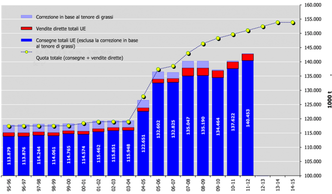 Figura 1 - Evoluzione delle quantità commercializzate di latte e delle quote nella UE, 1996/96-2014/15