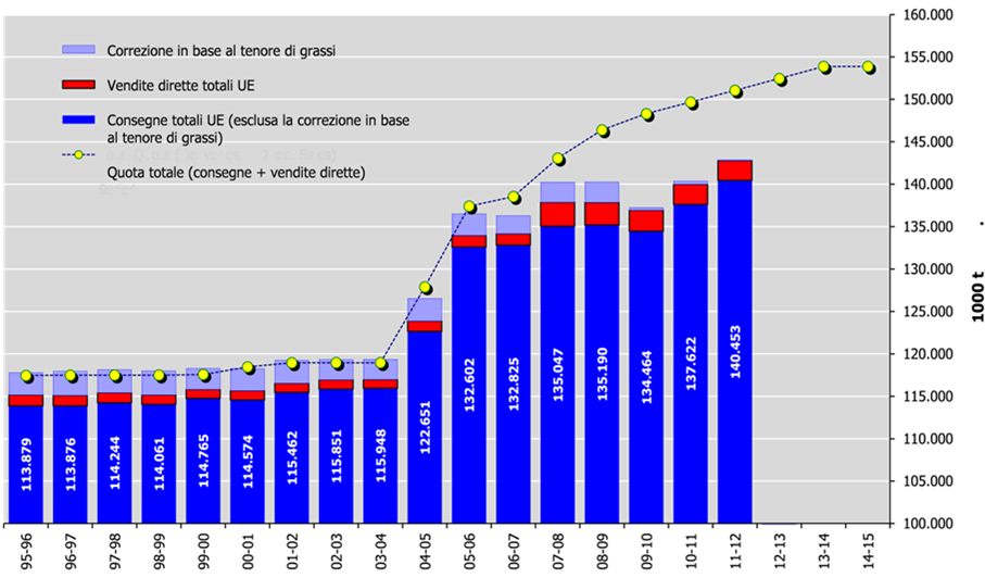 La forbice tra quanto si potrebbe produrre e quanto effettivamente si produce si sta allargando, ed è stata pari al 4,7% nella campagna 2011/12 e al 6,0% in quella 2012/13, poiché se taluni paesi riescono a sfruttare appieno il proprio quantitativo globale garantito (sono stati cinque su ventisette i paesi che nell’ultima campagna hanno superato la quota, ma in percentuali sempre molto contenute), molti stanno decisamente al di sotto. Il vero “atterraggio morbido”, in sostanza, non sta tanto nell’aumento graduale del limite delle quote, ma nei cambiamenti che hanno fatto sì che la produzione non aumentasse malgrado ne avesse la possibilità, ossia nello smantellamento del sostegno indiscriminato ai prezzi, combinato con un rigido protezionismo, che, per mantenere in vita le realtà produttive meno efficienti, regalava ricche rendite alle aziende già di per sé più competitive.