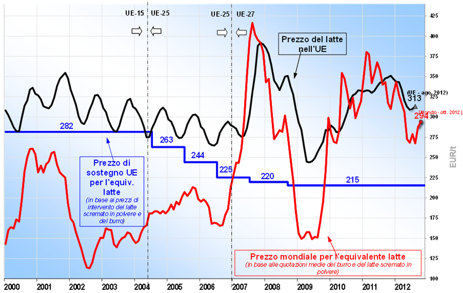 Figura 2 - Andamento del prezzo del latte sul mercato internazionale e nella UE, 2000-2012