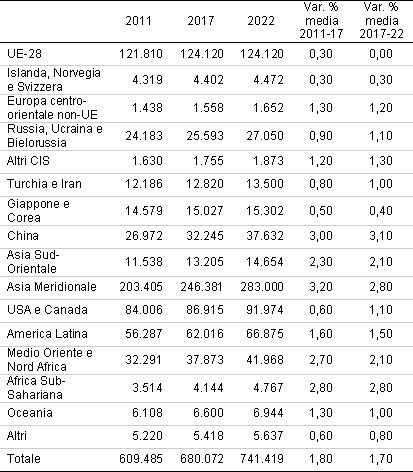 Tabella 1 - Evoluzione prevista della domanda mondiale di derivati del latte (milioni di tonnellate di latte-equivalente), 2011-2022