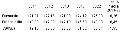 Tabella 2 - Evoluzione prevista della domanda, della disponibilità interna e del surplus di latte nell’Unione Europea (milioni di tonnellate di latte-equivalente), 2011-2022