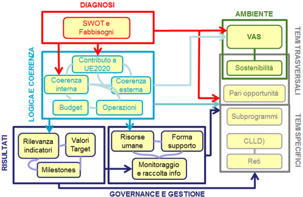 L’analisi della regolamentazione comunitaria per la programmazione per lo sviluppo rurale 2014-2020 lascia emergere un approccio comunitario costruttivo alla definizione della teoria del programma, teso a dare validità alle analisi di contesto, alla Swot e ai fabbisogni, che ne sono fondamento, al fine di garantire la migliore aderenza ai territori di riferimento e alle loro effettive esigenze di cambiamento. In questo senso, va letta anche la minimizzazione della previsione di schemi di riferimento per la strutturazione delle analisi di contesto e la Swot2, e il maggiore orientamento ad assicurare loro fondatezza, in termini di coerenza, completezza e adeguatezza, attraverso la continua interazione tra AdG, valutatori ex ante e Vas e il loro supporto metodologico. La diagnosi territoriale diviene pertanto un processo orientato alla costruzione e alla rifinitura progressiva della teoria del programma, teso a darle consistenza, e in cui emergono chiaramente, forse più che nel passato, le funzioni di ciascuna analisi: descrizione completa della situazione dei territori di riferimento (analisi di contesto), organizzazione delle variabili di contesto in chiave dinamica (analisi Swot) e lettura programmatica, in chiave di priorità, di focus area e temi trasversali alle politiche territoriali (ambiente; mitigazione e adattamento al climate-change; innovazione), dei fabbisogni e delle opportunità di sviluppo (analisi dei fabbisogni).