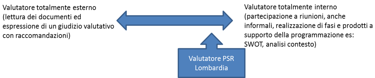 In una sorta di continuum che va da una posizione totalmente esterna, di un valutatore che si esprime solo sui documenti di programmazione attraverso il proprio giudizio valutativo, fino alla posizione di un valutatore partecipe (nel rispetto della propria indipendenza e terzietà) al processo di programmazione, il valutatore lombardo si posiziona a questo estremo.