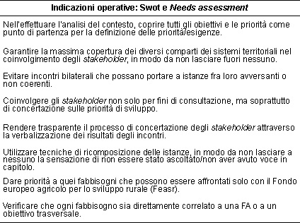 Secondo le indicazioni del network europeo di valutazione (Eenrd, 2012), la valutazione ex ante deve garantire che l'analisi Swot e la identificazione dei fabbisogni rispondano a una serie puntuale di requisiti: (a) siano complete e forniscano un quadro esaustivo del territorio; (b) si basino su dati appropriati e rendano possibile il benchmark con altri territori; (c) siano logicamente interconnesse; (d) siano coerenti e complementari con i diversi livelli di programmazione; (e) siano coerenti con la Vas; (f) tengano conto delle sei priorità dello sviluppo rurale e di quelle trasversali di UE 2020; (g) consentano di identificare fabbisogni particolari, anche per giustificare eventuali subprogrammi; (h) tengano conto delle indicazioni derivanti dalle programmazioni precedenti; (i) siano stati sviluppate in collaborazione con il partenariato.