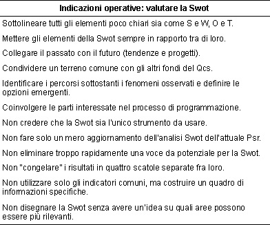 In termini più operativi, una valutazione della completezza della diagnosi dovrebbe prima di tutto giudicare se la Swot di programma risponde ai requisiti richiesti dalla Unione Europea, anche in relazione al format di presentazione richiesto (Eenrd, 2013a; Commissione Europea 2013c). L'analisi Swot sostanzialmente si può ritenere sufficiente solo se rappresenta una narrazione di sintesi della situazione di partenza di tutti i soggetti territoriali, settoriali, ambientali, sociali, al fine di individuare chiaramente le potenzialità e le disparità. È evidente che una Swot costruita come mero aggiornamento di analisi precedenti, o statica, o senza riferimenti a situazioni di confronto non può essere soddisfacente.