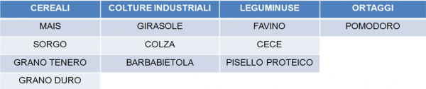 Come mostrato nella figura 2, le precessioni colturali sono state classificate in 4 tipologie: cereali (mais, sorgo, grano tenero e duro), colture industriali (girasole, colza, barbabietola), leguminose (favino, cece, pisello proteico), ortaggi (pomodoro). Tale classificazione serve a suddividere le colture in funzione della dotazione di nutrienti che lasciano nel suolo a disposizione per la coltura successiva.