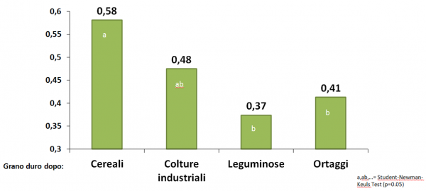 Figura 3 - Carbon footprint del grano per diverse precessioni colturali (t CO2-eq/t di grano duro)