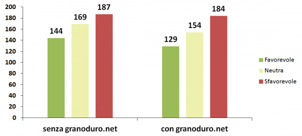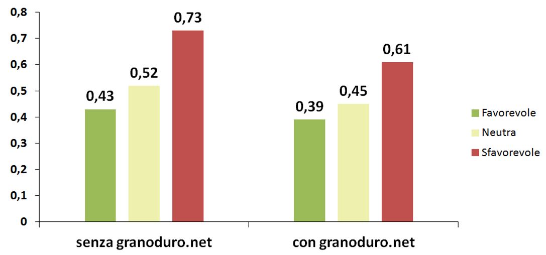 Successivamente, per valutare se una gestione agronomica accurata possa contribuire a migliorare ulteriormente le performance agronomiche ed economiche della coltivazione del grano, è stato testato l’utilizzo del sistema di supporto alle decisioni granoduro.net. In ognuna delle aziende agricole facente parti del campione il grano duro è stato coltivato in due parcelle adiacenti (e quindi con caratteristiche pedo-climatiche simili), la prima ha beneficiato dell’ausilio di granoduro.net e la seconda è stata invece coltivata secondo la tecnica normalmente utilizzata dall’agricoltore. A tale scopo le precessioni colturali sono state suddivise in favorevoli, neutre e sfavorevoli come mostrato in figura 6.