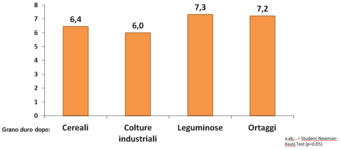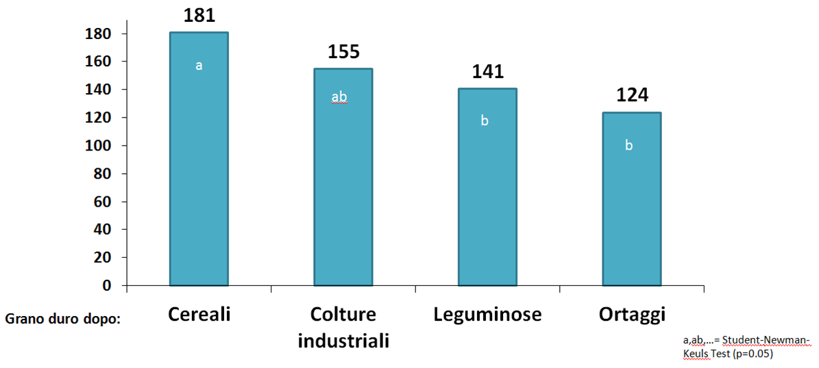 Come si può osservare nella figura 3, il carbon footprint del grano coltivato con una precessione colturale favorevole, come ad esempio una leguminosa, è risultato essere significativamente inferiore (-36%) rispetto a quello del grano coltivato con una precessione colturale sfavorevole, come ad esempio un cereale. Queste perché il grano trae beneficio dalle condizioni di fertilità dei suoli lasciate da determinate colture. Le leguminose ad esempio sono in grado, tramite la simbiosi con una determinata tipologia di funghi, di assorbire l’azoto atmosferico e di renderlo disponibile nel terreno per le colture successive, che avranno quindi un minor bisogno di fertilizzanti azotati di sintesi.