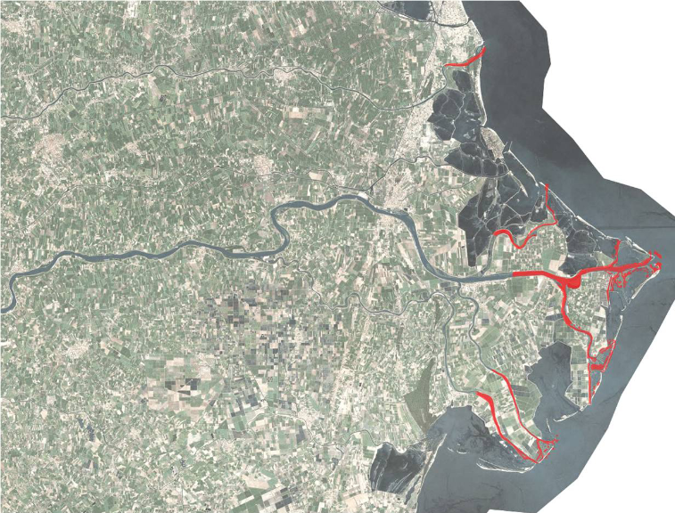 Il fenomeno ha comportato conseguenze rilevanti all’interno del territorio del delta, come riportato nella figura 2. La risalita infatti si è verificata in modo ridotto in corrispondenza degli anni Cinquanta – Sessanta (Figura 2.a), dove ha raggiunto i primi 2-3 chilometri dalla foce. Tale fenomeno rappresenta un andamento ordinario, poiché lo spazio di transizione tra acque dolci e salate in ambito estuariale, è solito verificarsi a seguito dell’incontro tra processi mareografici e fluviali nello spazio prospiciente la costa. Nel caso siano presenti ulteriori fattori la risalita del cuneo salino risulta più accentuata, come nella figura 2.b relativa agli anni settanta-ottanta, in cui ha raggiunto i 10 chilometri dalla foce, provocando l’impossibilità di irrigare un territorio pari a circa 20.000 ettari, corrispondenti all’Isola di Camerini, della Donzella e di Ca’ Venier. Infine nella figura 2.c, che rappresenta l’anno 2000, è stato raggiunto il livello massimo di risalita del cuneo salino, pari a i 25-30 chilometri dalla foce. Tale andamento ha comportato di conseguenza la formazione di un’area soggetta a sofferenza idrica pari a circa 30.000 ettari, non garantendo di conseguenza l’irrigazione anche in corrispondenza dell’Isola di Porto Viro e di Ariano (Colombo e Tosini, 2009). Secondo dati più recenti invece, l’intrusione salina ha raggiunto circa i 15-20 chilometri dalla foce, dimostrando quindi che il fenomeno sia quanto più attuale.