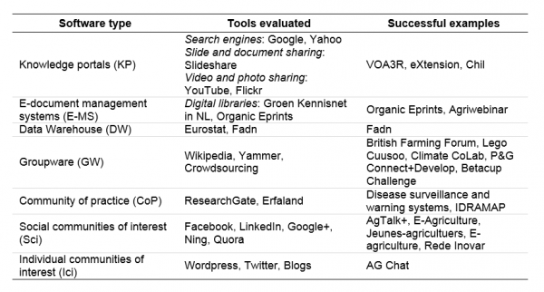 Table 1 - Software types, evaluated tools (in bold text) and other examples of tools of the different types and successful examples of application of the tools, mainly in agriculture