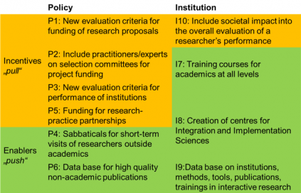 Special attention is needed to incentivize research to be responsive to the needs of innovation processes. Table 2 presents ten recommendations form a desk research carried out by Fibl (Home et al., 2013). These include six potential changes at the level of research policy, e.g. the creation of evaluation criteria for both research proposals and research institutes to stimulate transdisciplinary and interactive research, the involvement of practitioners in research funding and evaluation processes, the support for sabbaticals and short-term visits to stimulate exchange of practices between stakeholders, the creation of funding for projects that involve science and practice on an equal footing and the establishment of an easily accessible data base for high quality non-academic publications/articles. The other four recommendations are formulated with regard to research institutions. They concern the development of targeted training courses to enhance the necessary skills for effective science-practice interaction, the creation of specialised centres and of a new discipline Integration and Implementation Sciences, the establishment of a data base with information about institutions, methods, tools, publications and trainings on interactive research and, finally, including the assessment of a researcher’s (non-academic) societal impact into the overall evaluation of his/her performance. It will depend on the national or regional Akis how relevant the recommendations are. But it is clear that at least for some of the Horizon2020 project calls and national funded research better incentives can be installed to link innovation and research.