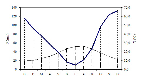 Sulla base dell’indice climatico proposto da Thornthwaite (1948), determinato dai dati rilevati dalla stazione meteo di Tarsia, si ottiene un valore di -8,55, valore che individua il tipo subarido (C1). Il termoudogramma (Figura 2), secondo Bagnous e Gaussen (1957), evidenzia come il periodo arido sia compreso tra maggio e settembre. Dal punto di vista fitoclimatico, sulla base della classificazione proposta dal Pavari (1916), il sito ricade nel Lauretum II tipo sottozona calda. La vegetazione sul versante idrografico destro dell’invaso è quella della macchia mediterranea con prevalenza di Leccio (Quercus ilex L. ) e Olmo (Ulmus minor Miller) mentre il versante sinistro presenta principalmente piantagioni ad uliveti. In base alle sue peculiarità faunistico-vegetazionali, l’area ricade per una superficie di 434 ha, nella Riserva Naturale Regionale istituita con legge regionale n. 52 del 05/05/1990. Il lago è punto di passaggio dell’avifauna migratrice (Callegari, al., 2011). Dal punto di vista ittico l’invaso ha vocazione ciprinicola con prevalenza della Carpa (Cyprinus carpio L.).
