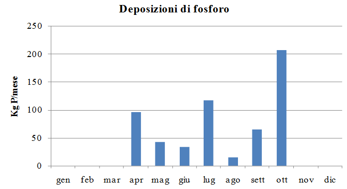 Il contributo totale annuo di fosforo proveniente da tali fonti è stato stimato (Frega, Infusino, 1991; Infusino 2009) in 1.886 kg P/anno La quantità di fosforo che giunge sulla superficie dello specchio liquido con le deposizioni atmosferiche è stata valutata dagli estesi rilevamenti eseguiti presso la stazione di S. Antonello di Montalto Uffugo nella media valle del Crati (Figura 4).