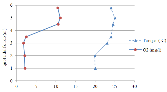 Durante la fase di riempimento dell’invaso avviene la stratificazione delle masse d’acqua. Infatti, dal profilo dell’ossigeno e della temperatura (Figura 7), eseguito in corrispondenza delle massime profondità che si raggiungono nei pressi del corpo diga, si osserva che l’epilimnio interessa uno strato superficiale di circa 1,5 m dove l’ossigeno disciolto, durante le ore diurne, a causa della presenza di una ricca flora algale, è in sovrasaturazione e la temperatura media è prossima a quella dell’aria (24 °C). Al disotto di tale strato, la concentrazione di ossigeno subisce una brusca riduzione con la formazione di un termoclino, cioè lo strato che si estende tra la quota, da 3,5 a 4,5 metri dal fondo. Nell’ipolimnio, la concentrazione di ossigeno è di 2 mg/l (con ossigeno a saturazione mediamente di 22,4%) ma non si annulla, probabilmente a causa del richiamo di acqua superficiale dovuta all’apertura parziale delle paratie di fondo. Dallo spessore dell’epilimnio è possibile determinare che il volume di acqua interessato da detto strato, definito “Wep”, sia circa la metà di quello totale W.