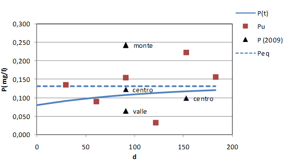 Al fine di verificare se i dati sperimentali interpretano il modello di cui all’equazione (12) è necessario individuare il tasso di consumo k, che per situazioni analoghe l’Epa fornisce valori compresi tra 0,001-0,1 (Brown, Barnwell, 1987) per valutare la concentrazione di fosforo di equilibrio. Dalle analisi eseguite si ottiene un tasso di consumo k medio pari a 0,00825 d-1, quindi in linea con quanto proposto dall’Epa. Dalla (11) si può determinare la concentrazione di equilibrio Peq che è pari a 0,1318 mg/l e, considerando la concentrazione iniziale P0 in uscita del mese di aprile, è possibile applicare il modello (12) per la stima della concentrazione dell’invaso che è riportato nella Figura 8.