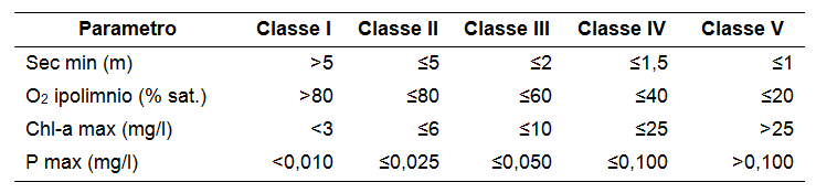 Nel D.lgs. 152/99 lo stato ecologico degli invasi è suddiviso in cinque classi sulla base delle misure dello stato trofico caratterizzato dai parametri: fosforo totale (P), ossigeno disciolto (O2% su quello a saturazione), trasparenza (Sec) e clorofilla “a” (Chl-a). La classe è attribuita in base al risultato peggiore tra i parametri indicati (Tabella 1).