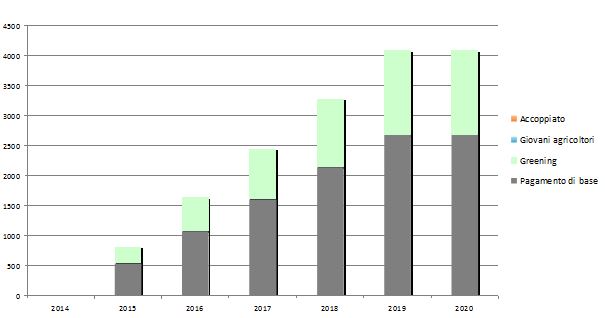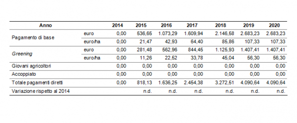 Il Vui si colloca tra il 90% e il 100% del Vun, quindi il pagamento di base e il pagamento verde rimangono costanti dal 2014 al 2020. Se invece il Vui fosse stato inferiore al 90% del Vun, l’agricoltore avrebbe ottenuto un aumento graduale del pagamento di base, pari ad un terzo della differenza tra il Vui e il 90% del Vun, in virtù della garanzia che ciascun agricoltore raggiunga un pagamento minimo pari al 60% della media regionale/nazionale entro il 2019.