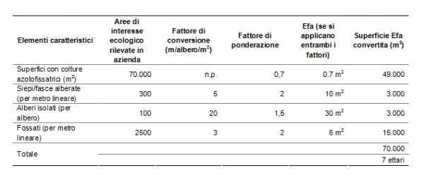 Gli agricoltori potranno trovare soluzioni efficienti con la destinazione ad Efa dei bordi dei campi, colture azotofissatrici, ecc.; i tecnici agrari dovranno valutare ed individuare le soluzioni più idonee per ogni areale agricolo e per ogni agricoltore. In tabella 4 è riportato un esempio di calcolo di Efa mediante i fattori di conversione e/o di ponderazione. L’agricoltore in questione deve realizzare 7 ettari di Efa e raggiunge questo obiettivo con le colture azotofissatrici, le siepi, gli alberi isolati e un fossato.
