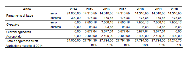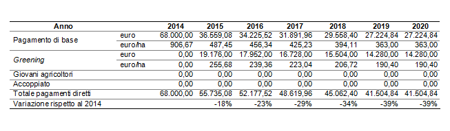 Nel caso in questione, i pagamenti diretti totali passano da 68.000 euro a 41.504 euro e i pagamenti diretti unitari da 906 euro/ha a 553 euro/ha.