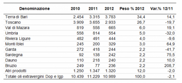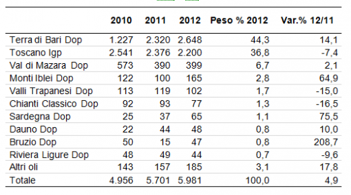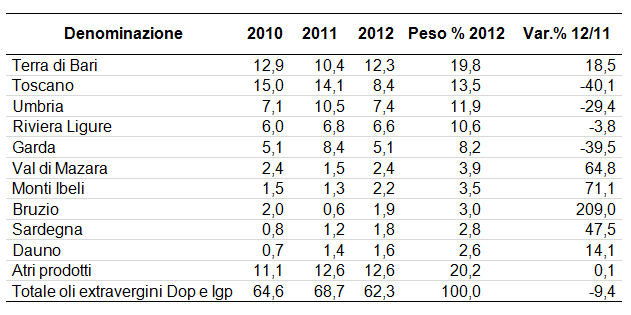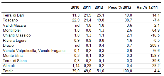 Scendendo nel dettaglio delle singole denominazioni, si registrano aumenti delle quantità certificate per il Terra di Bari (+14%), Monti Iblei (+65%),ma soprattutto per la Dop Bruzio, mentre contrazioni per il Toscano e per l’Umbria. In termini di fatturato all’origine, sempre con riferimento al 2012, si evidenzia una contrazione del 4% rispetto al 2011, con notevoli diminuzioni ascrivibili soprattutto alla Dop Garda, cui segue Umbria (-31%),Sabina (-26%), Toscano (-12%). Gli incrementi maggiori, di contro, si sono registrati per la Dop Bruzio, cui segue Monti Iblei e la buona tenuta delle altre, fra le quali Terra di bari.