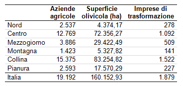 Aziende e superfici sono localizzate soprattutto al Centro ma anche nel Mezzogiorno e molto di meno al Nord. Inoltre, le aziende olivicole e le relative superfici sono presenti soprattutto in collina e in misura molto minore in pianura. Più bassa la loro presenza in zone montane.