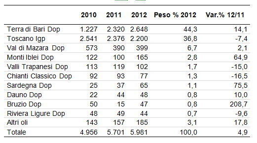Tabella 5 - Volumi esportati per gli oli Dop e Igp (tonnellate). Anni 2010 - 2012