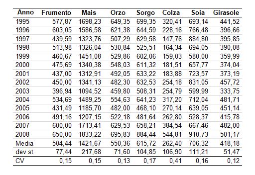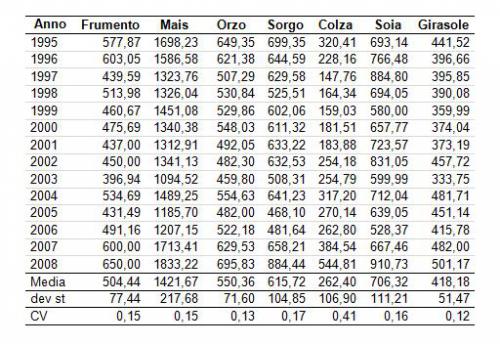 Tabella 2 - Redditi lordi con media, deviazione standard e CV rilevate nel periodo 95-08 per le produzioni agricole considerate (valori in euro riferiti ad ettaro)